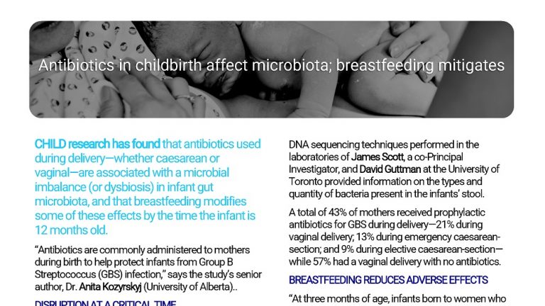 CHILD research has found that antibiotics used during delivery—whether caesarean or vaginal—are associated with a microbial imbalance (or dysbiosis) in infant gut microbiota, and that breastfeeding modifies some of these effects by the time the infant is 12 months old.