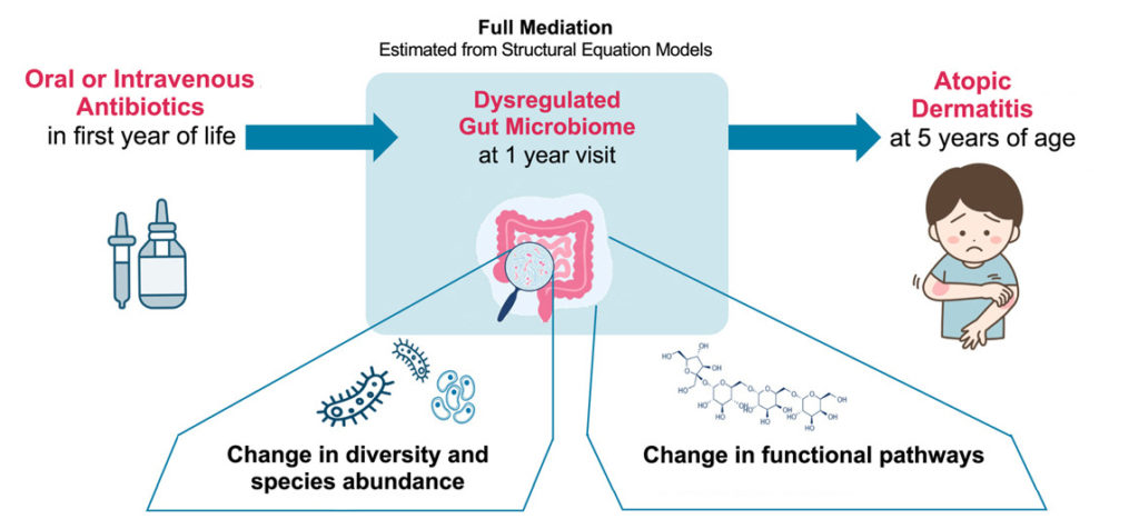 “This shared microbiome ‘signature’ suggests that the use of antibiotics before one year has a strong indirect effect on the development of atopic dermatitis, through the changes these antibiotics cause in the one-year gut microbiome,” says co-senior author Dr. Turvey.