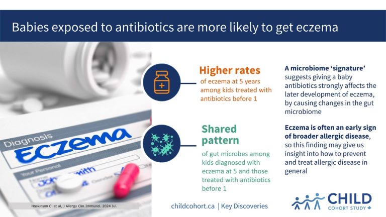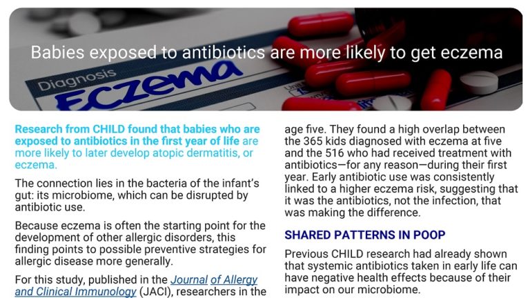 Research from CHILD found that babies who are exposed to antibiotics in the first year of life are more likely to later develop atopic dermatitis, or eczema. The connection lies in the bacteria of the infant’s gut: its microbiome, which can be disrupted by antibiotic use.