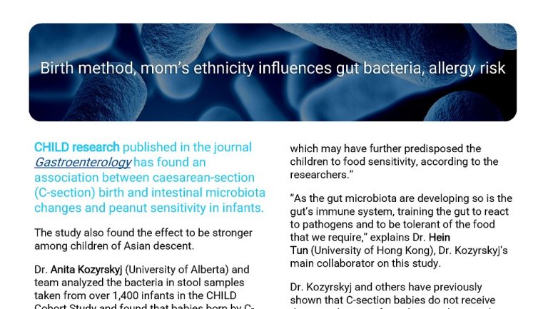 Dr. Anita Kozyrskyj (University of Alberta) and team analyzed the bacteria in stool samples taken from over 1,400 infants in the CHILD Cohort Study and found that babies born by C-section had low levels of Bacteroides – a critical bacteria for immune system development.