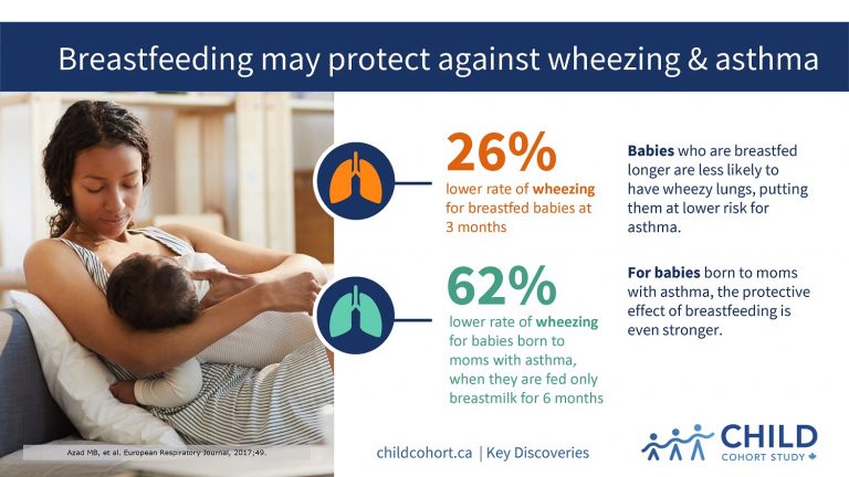 The study, published in the European Respiratory Journal in 2017, found that at three months of age, infants who were exclusively breastfed had a 26% reduced rate of wheezing compared to infants who were not breastfed.