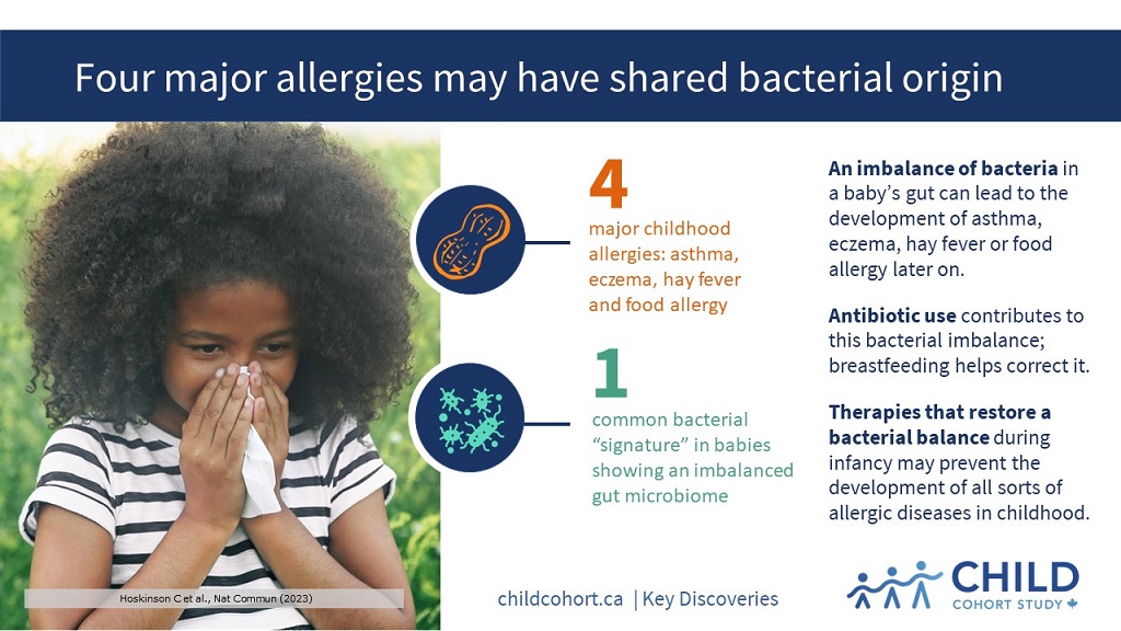 Several major childhood allergies may share a common link to the community of bacteria living in our gut, according to a new study led by CHILD researchers at BC Children’s Hospital and the University of British Columbia (UBC).