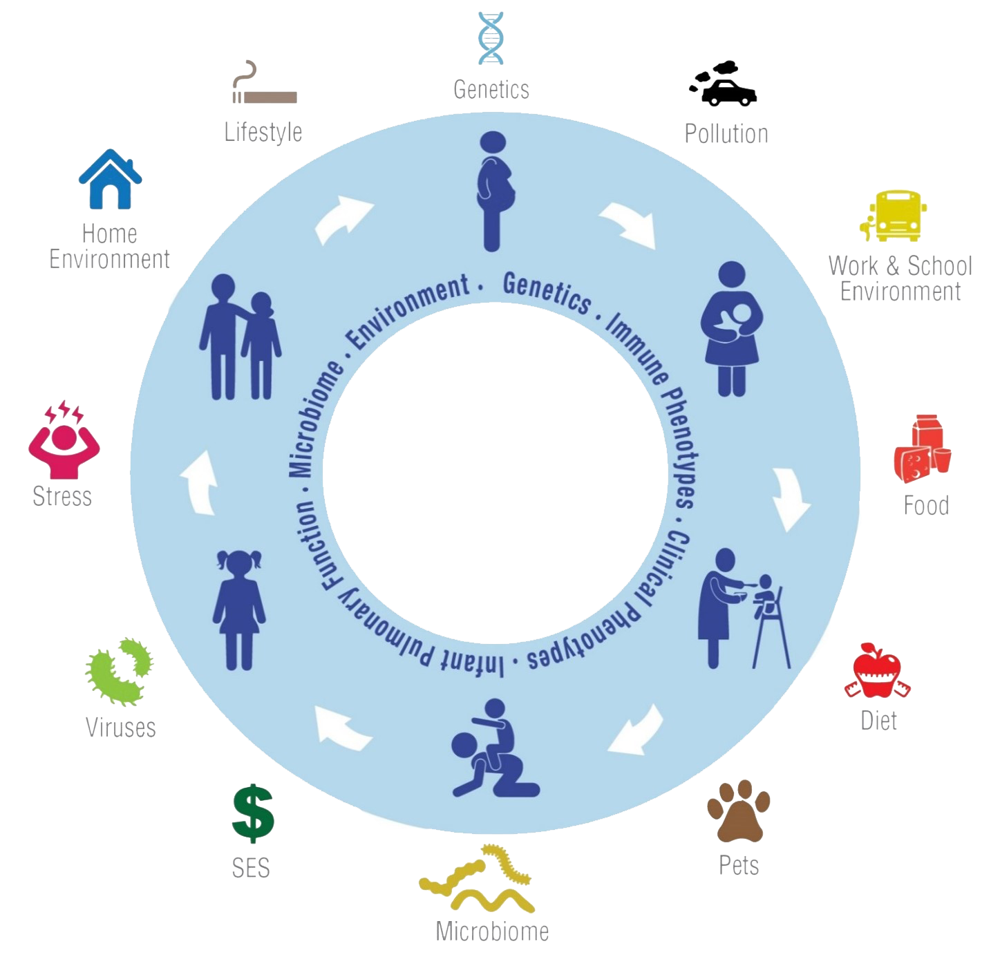 The CHILD Cohort Study’s strengths include its longitudinal multi-disciplinary approach; capture of type, amount and timing of numerous environmental exposures; capacity for epigenetic evaluations over time; and ability to apply sophisticated bioinformatics of critical mechanistic pathways leading from exposure to disease.