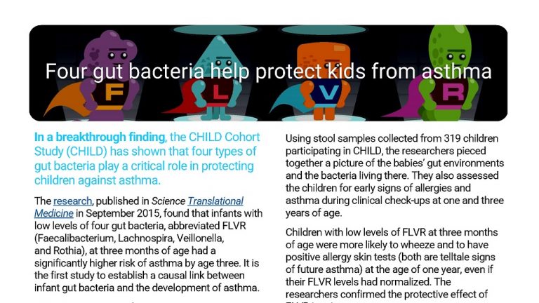 In a breakthrough finding, the CHILD Cohort Study (CHILD) has shown that four types of gut bacteria play a critical role in protecting children against asthma.