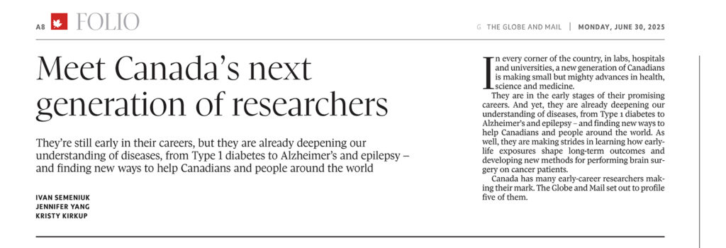 The two-page spread, entitled “Meet Canada’s next generation of researchers,” appeared in the Folio section of the Globe on 30 June 2025. With weekly readership of more than 6 million in 2024, the Globe is one of the country’s most read newspapers and is widely regarded as Canada’s “newspaper of record.”