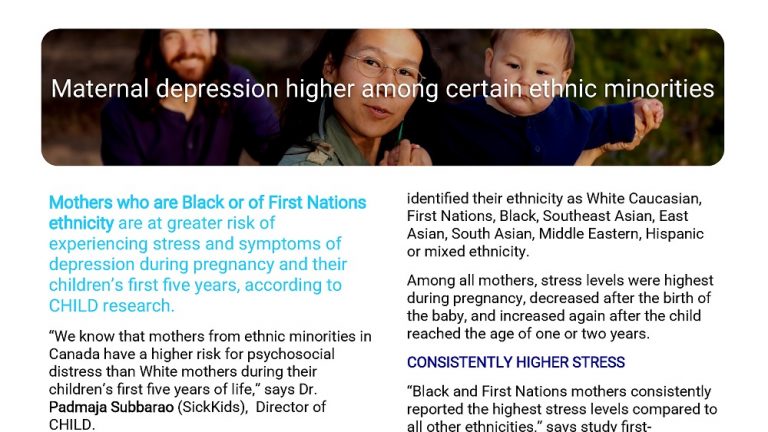 “We know that mothers from ethnic minorities in Canada have a higher risk for psychosocial distress than White mothers during their children’s first five years of life,” says Dr. Padmaja Subbarao (SickKids), Director of the CHILD Study.