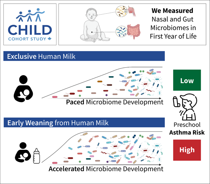 “These findings strongly suggest that, through its profound impact on the infant microbiome, human milk plays a vital role in long-term respiratory health,” said CHILD Deputy Director Dr. Meghan Azad, co-leader of this research, who is also Director of MILC and a professor at the University of Manitoba, a Research Scientist at the Children’s Hospital Research Institute of Manitoba (CHRIM), and Canada Research Chair in Early Nutrition and the Developmental Origins of Health and Disease.