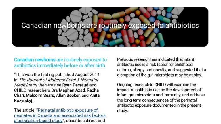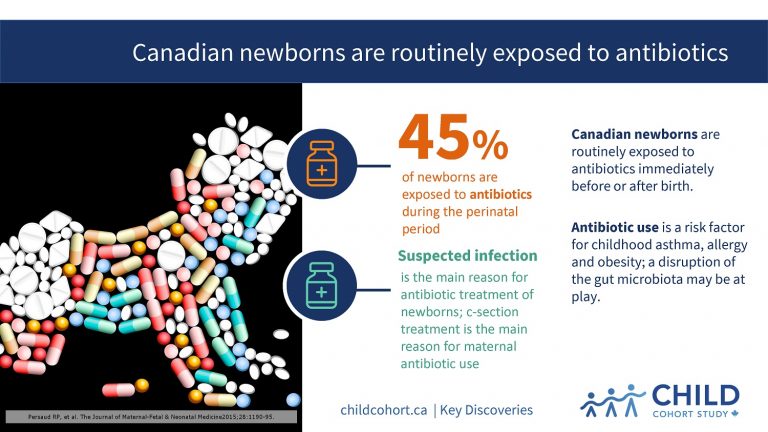 Ongoing research in CHILD will examine the impact of antibiotic use on the development of infant gut microbiota and immunity, and address the long-term consequences of the perinatal antibiotic exposure documented in the present study.