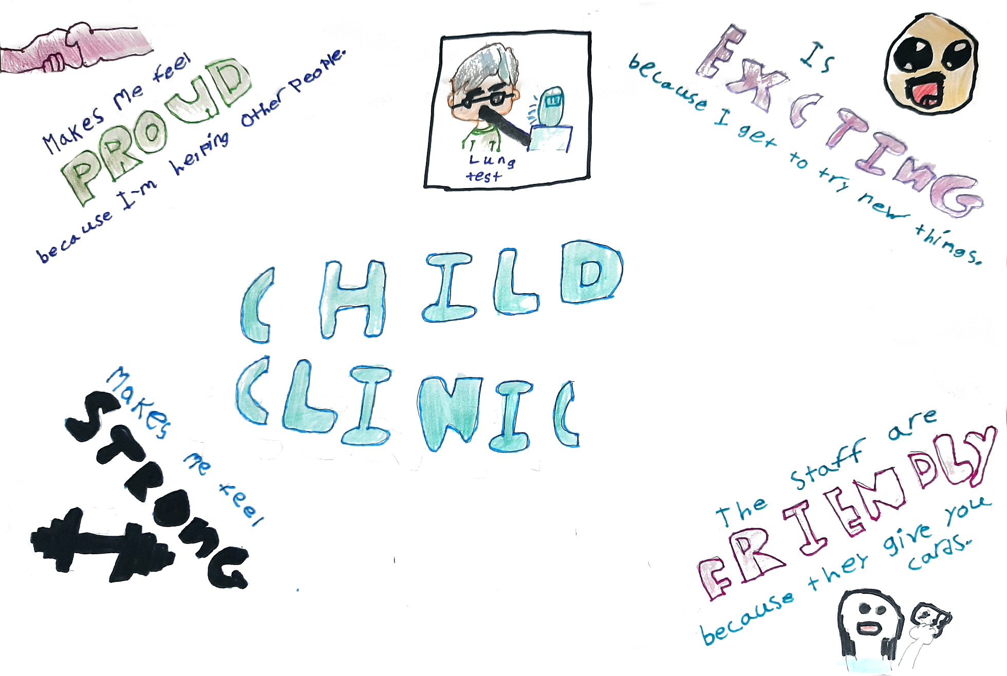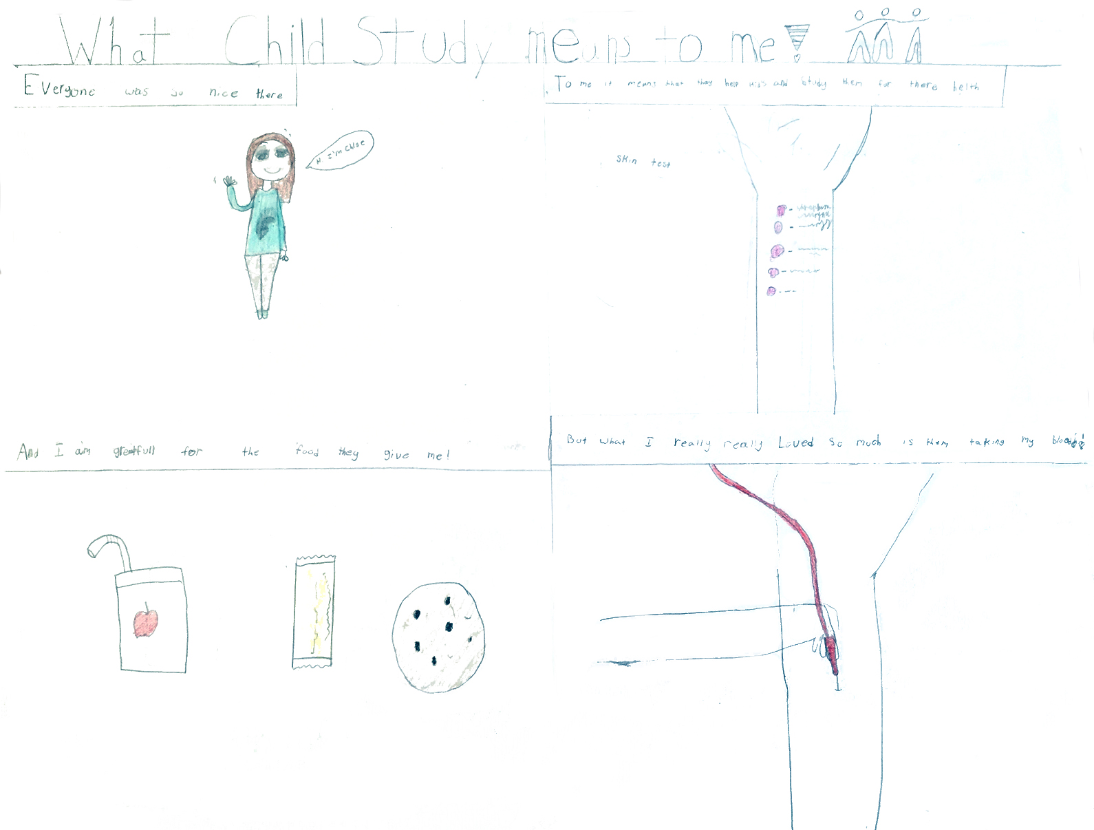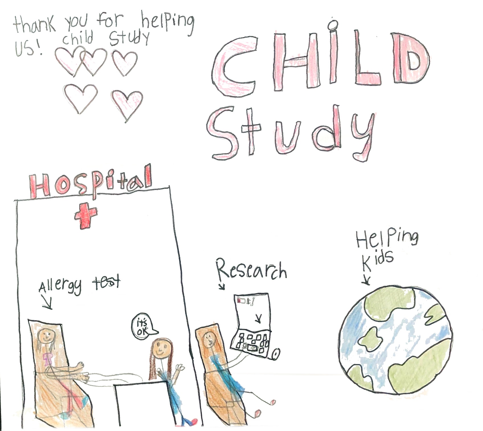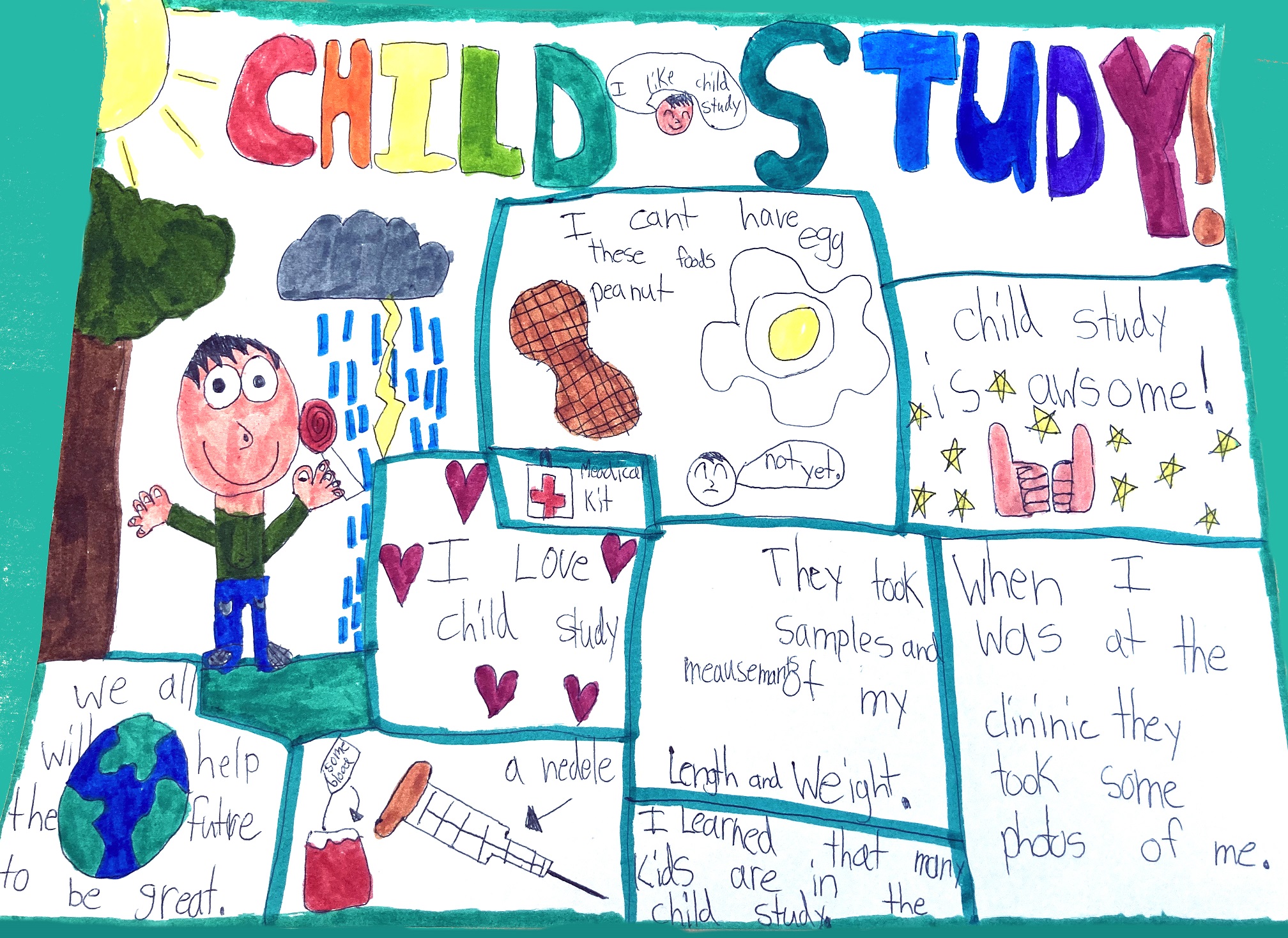 My poster is about all the fun things I got to do at Sick Kids Hospital for the Child Study. From my mom completing surveys to me doing breathing tests. Thank you to all the kids who are participating!