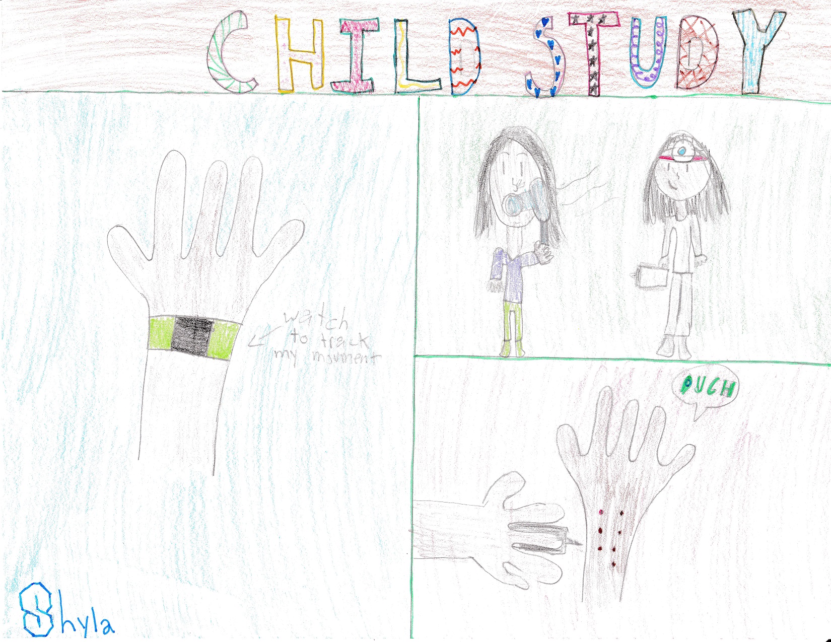 ​My poster is about the wonderful things the CHILD cohort study has done. On one of my visits, I got scared when my mom told me about the blood test, but I realized it was not so bad because they gave me a special cream. My favourite part was when hug robot squeezed my arm. I also liked it when I wore the GPS. Some of the other things I got to do was the breathing test, the allergy test and the pee and poo samples. One thing CHILD has discovered was that if a mom is having artificial sweetener during pregnancy, the baby has a higher risk of obesity.
