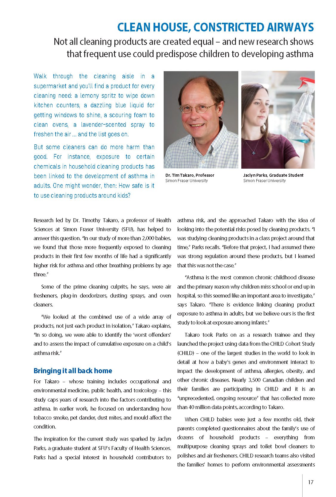 household cleaners, cleaning products, asthma, recurrent wheeze, atopy, gut microbiome, airborne chemicals, fragranced, scented products, disinfectants, spray, aerosols | Tim Takaro, Jaclyn Parks |