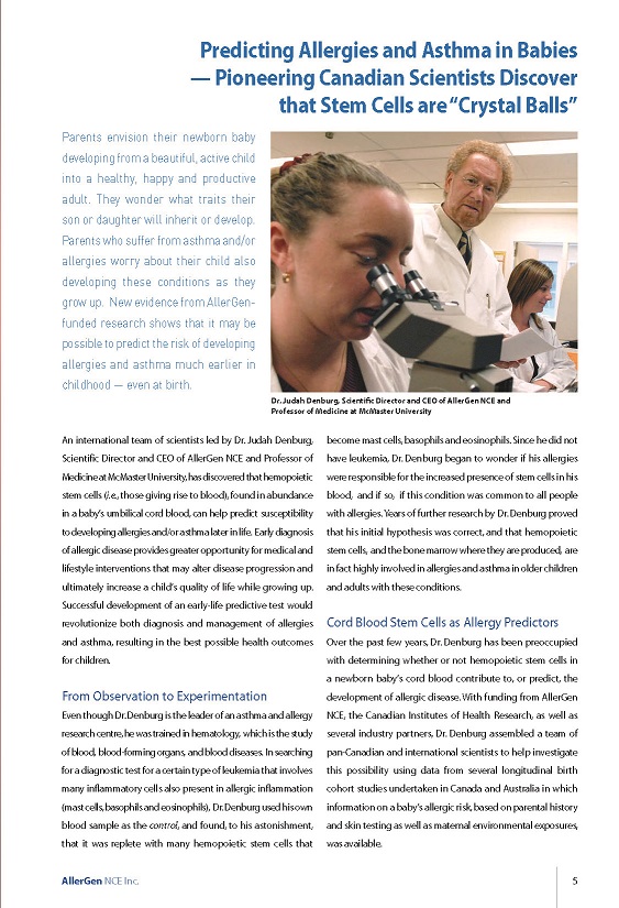 stem cells, umbilical cord blood, asthma, allergy, early-life predictive test | Judah Denburg, Guy Delespesse, Mark Larché, Kelly McNagny, Gail Gauvreau, Anne Ellis |