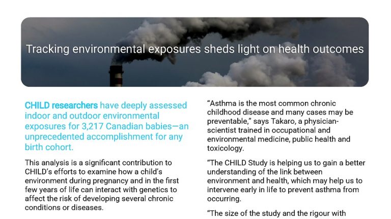 “The CHILD Study is helping us to gain a better understanding of the link between environment and health, which may help us to intervene early in life to prevent asthma from occurring. The size of the study and the rigour with which we assess environmental exposure will increase our capacity to detect associations between environmental factors and health outcomes.”
