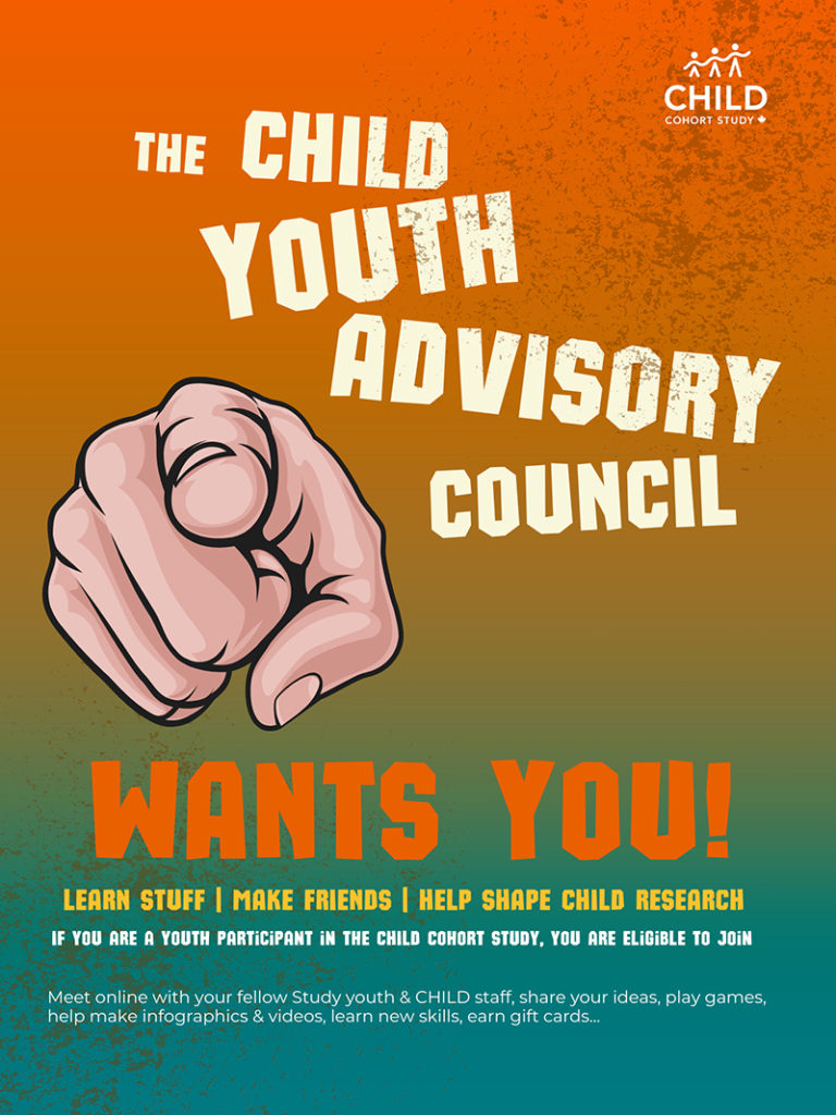 The CHILD Youth Advisory Council is a space for youth participants in the Study to meet each other, share their ideas, and help with Study planning.